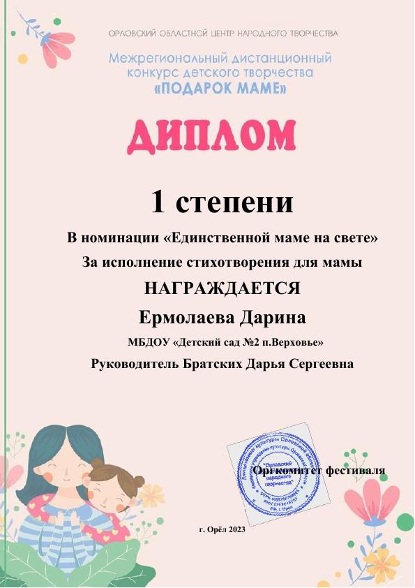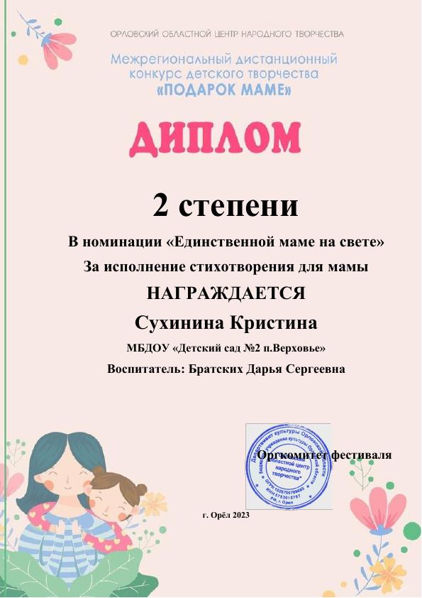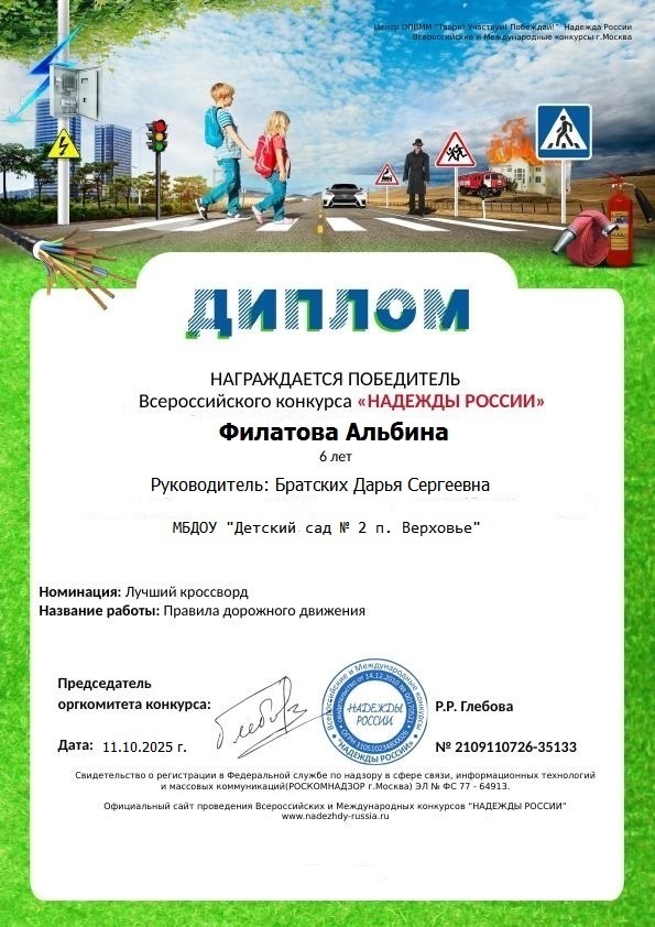 Почетная грамота Начальника Управления образования Верховского района за добросовестный труд в системе образования, творческий подход к обучению и воспитанию детей дошкольного возраста (Приказ № 149 от 22 августа 2025 года).