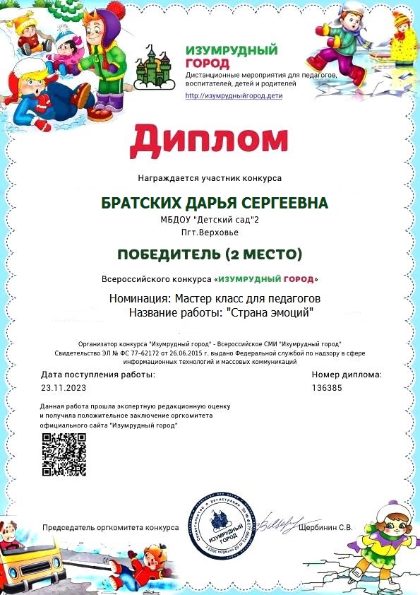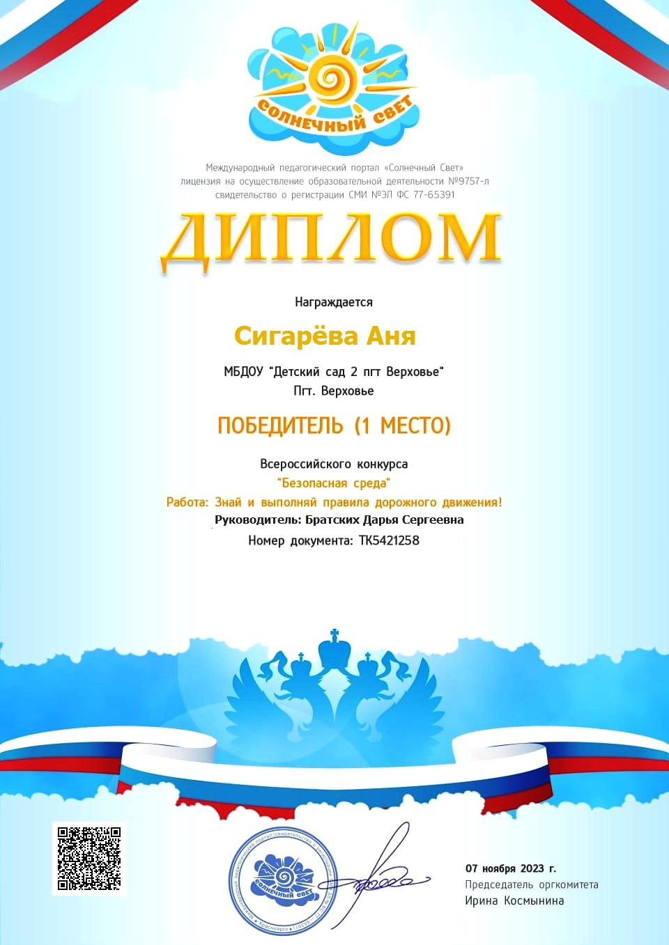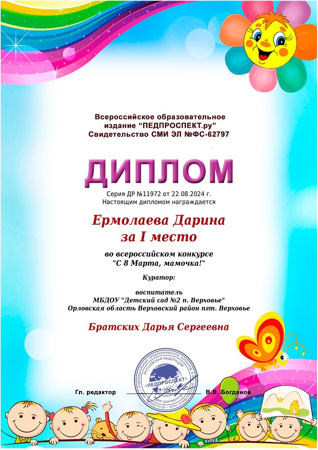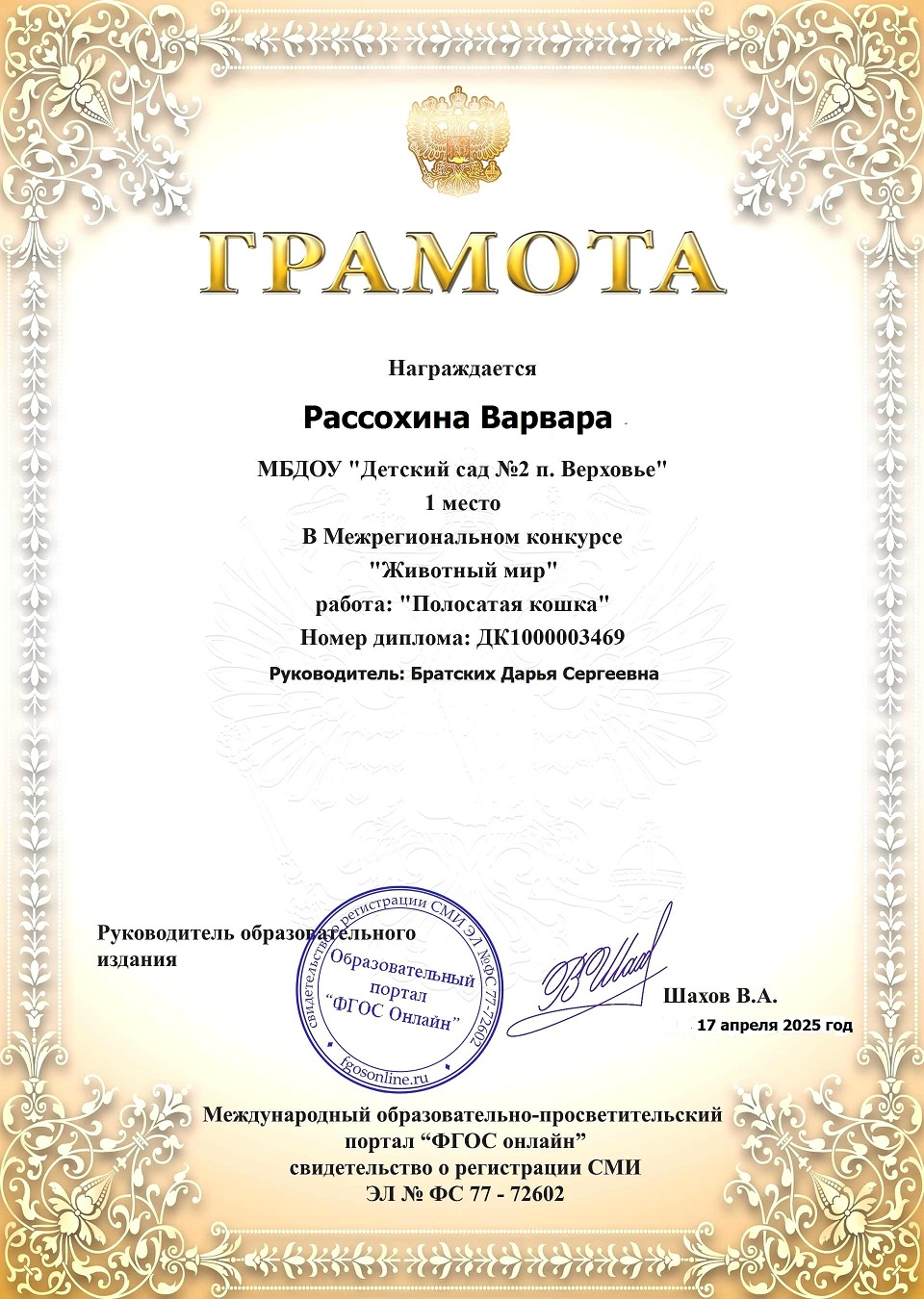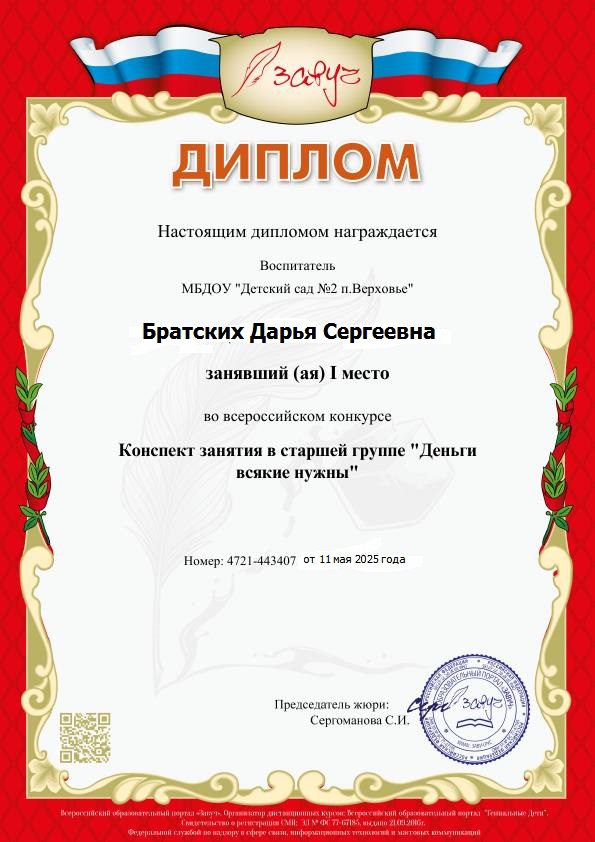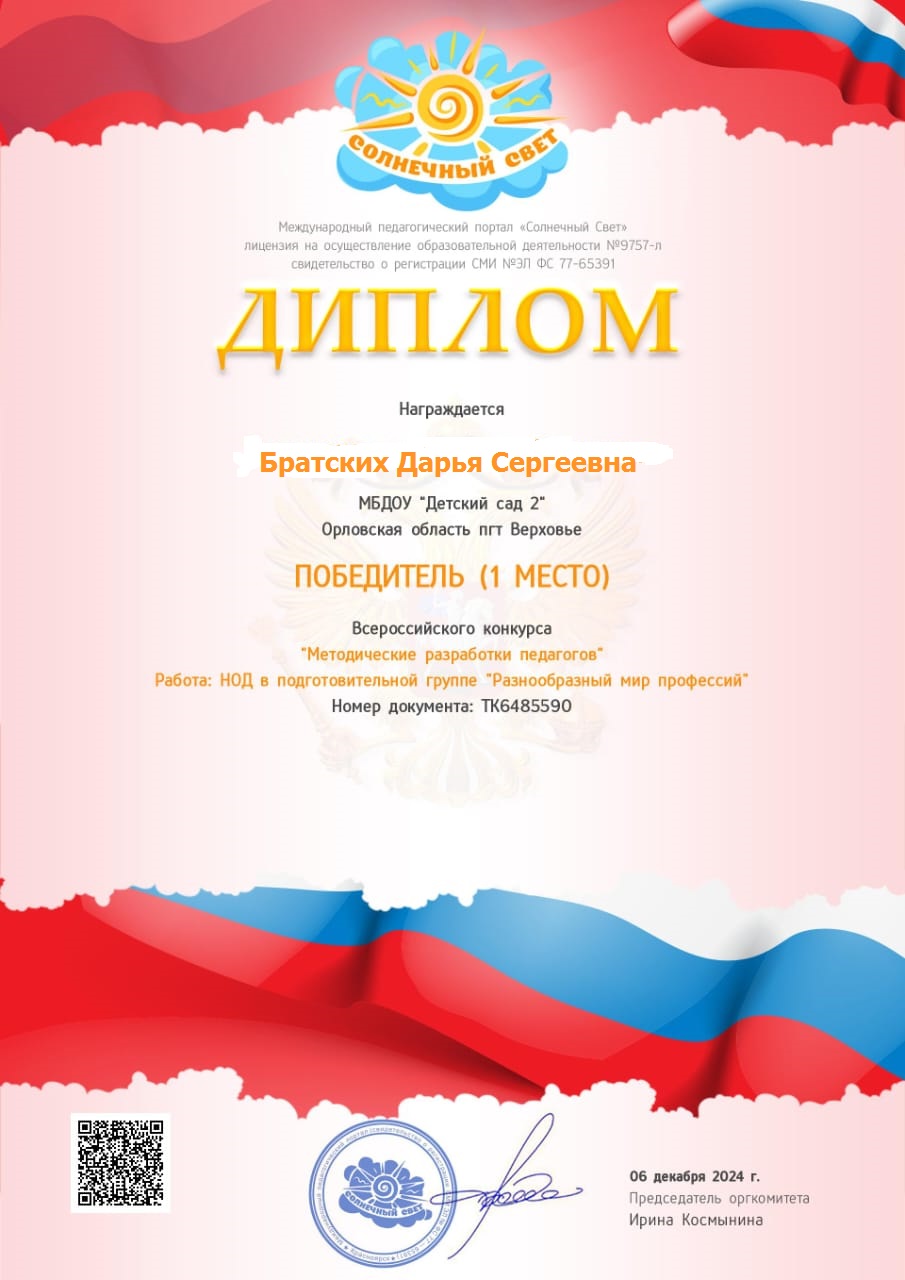 Место работы: Муниципальное бюджетное дошкольное образовательное учреждение "Детский сад № 2 п.Верховье" |