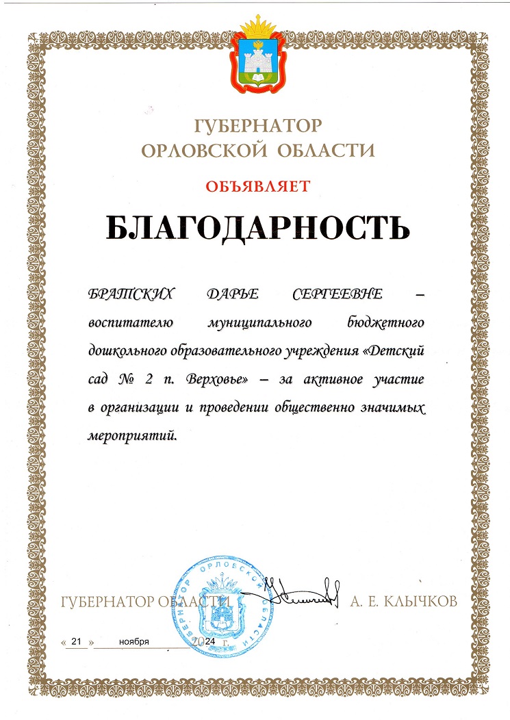 Благодарность Губернатора Орловской области за активное участие в организации и проведении общественно значимых мероприятий (ноябрь 2024 год).