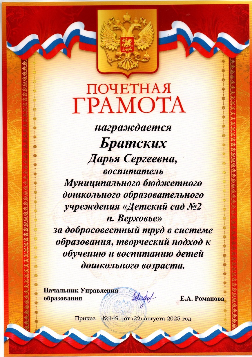 Почетная грамота Начальника Управления образования Верховского района за добросовестный труд в системе образования, творческий подход к обучению и воспитанию детей дошкольного возраста (Приказ № 149 от 22 августа 2025 года).