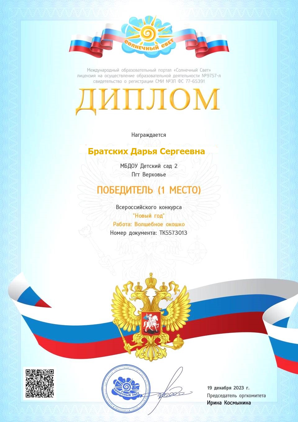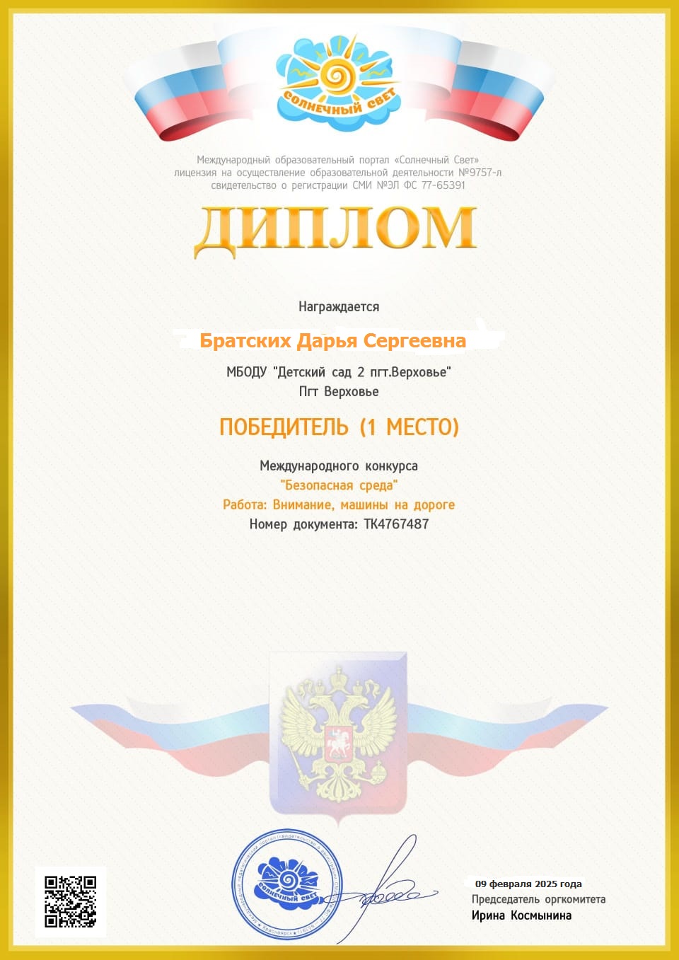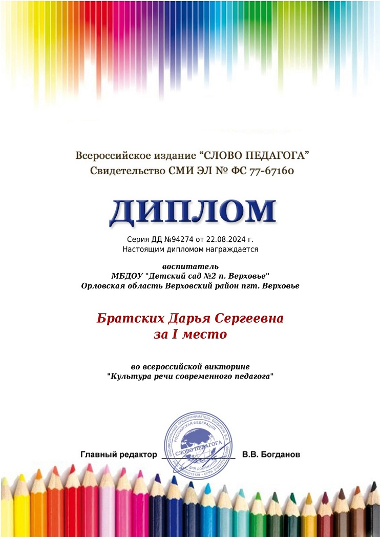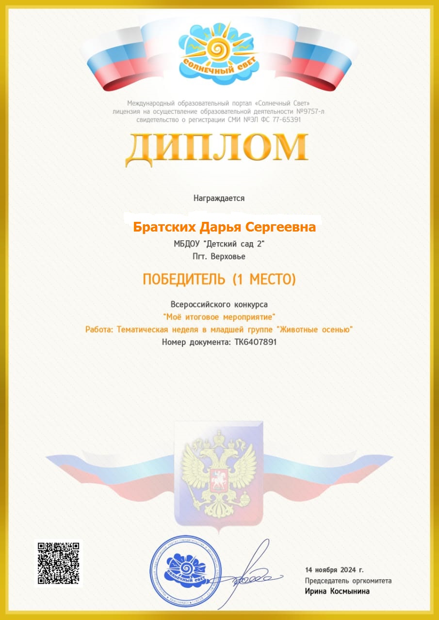 Место работы: Муниципальное бюджетное дошкольное образовательное учреждение "Детский сад № 2 п.Верховье" |