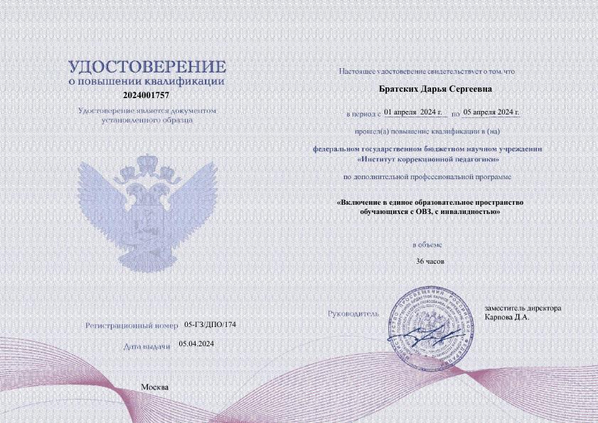 «Включение в единое образовательное пространство обучающихся с ОВЗ, с инвалидностью» (Федеральное государственное бюджетное научное учреждение «Институт коррекционной педагогики») в объеме 36 часов, 01.04-05.04. 2024. Удостоверение о повышении квалификации 2024001757 |