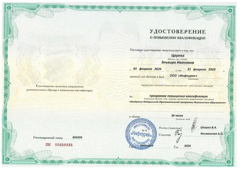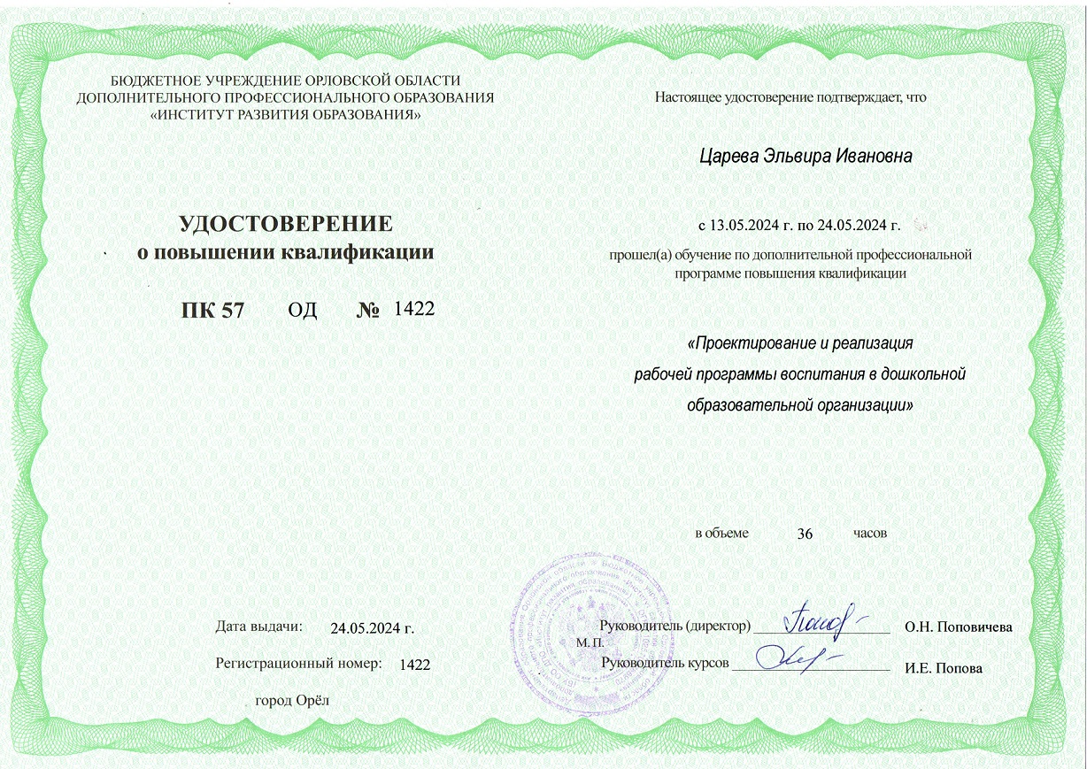«Проектирование и реализация рабочей программы воспитания в дошкольной образовательной организации» 13.05-24.05.2024 г. (БУ ОО ДПО «Институт развития образования») Удостоверение ПК 57 ОД № 1422 «Внедрение федеральной образовательной программы дошкольного образования» 01.02-21.02.2024 г. (ООО Инфоурок, г. Смоленск) Удостоверение ПК 00658825 "Инклюзивное образование детей с ограниченными возможностями здоровья в образовательной организации в соответствии с ФГОС НОО ОВЗ и ФГОС ОУО" 10.05.-13.05.2023 год (БУ ОО ДПО "Институт развития образования" ) Удостоверение ПК 57 ХК № 0065 "Совершенствование профессиональных компетенций педагогических и руководящих кадров образовательных организаций в современной практике конкурсного движения"- 17.02-22.2022 год (БУ ОО ДПО "Институт развития образования) Удостоверение ПК 57 ДК № 0557 |