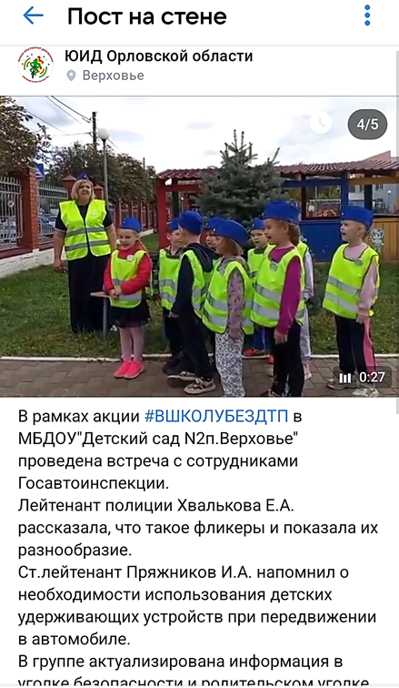 В сентябре в рамках акции в #ВШКОЛУБЕЗДТП родительский патруль и члены отряда ЮПИД «Непоседы» МБДОУ «Детский сад № 2 п.Верховье» вместе с сотрудниками Госавтоинспекции УМВД России по Верховскому району лейтенантом полиции Хвальковой Е.А., старшим лейтенантом Пряжниковым И.А.провели первое в этом учебном году профилактическое мероприятие с раздачей родителям памяток о светоотражателях, напомнили об использовании детских удерживающих устройств при передвижении в автомобиле и соблюдении ПДД. В группе актуализирована информация в уголках безопасности и родительском.