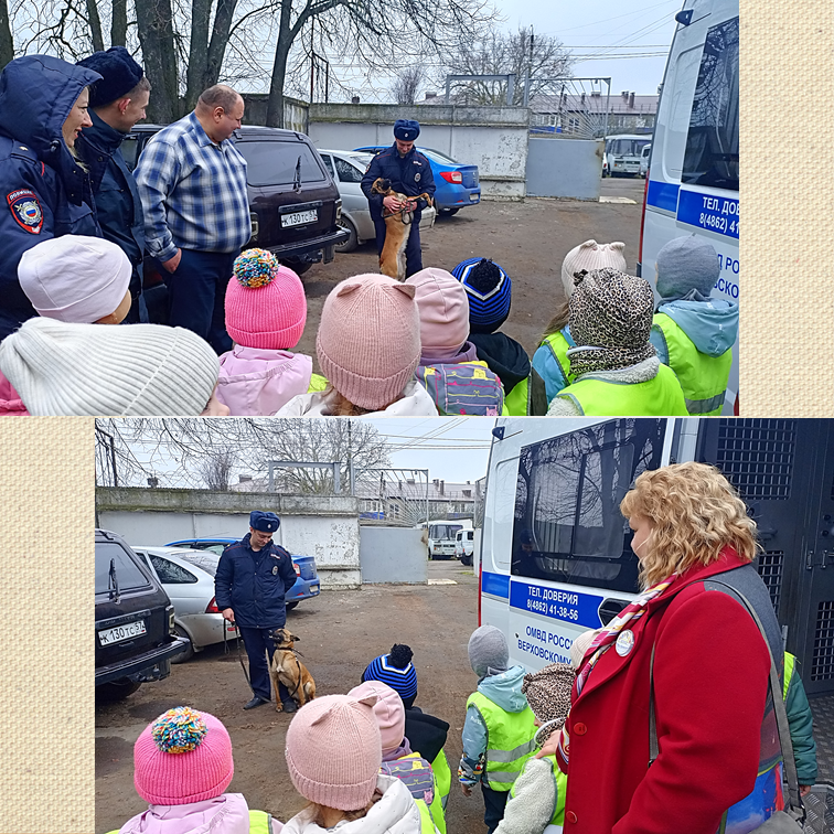 10 ноября в нашей стране отмечается День полиции. В этот день воспитанники отряда ЮПИД «Непоседы» подготовили поздравительную стенгазету и отправились на экскурсию в отдел МВД России по Верховскому району. У дверей здания воспитанников радушно встретили начальник ОМВД России по Верховскому району, подполковник полиции Третьяков Сергей Александрович, специалисты по работе с личным составом ОМВД. Они рассказали о трудностях, большой ответственности и престиже профессии полицейского. Сотрудники полиции продемонстрировали юным гостям чемоданчик эксперта криминалиста, с которым они выезжают на происшествия. Объяснили, как обнаружить отпечатки пальцев на предмете. Показали вооружение, которым экипируется полицейский, выходя на свое дежурство, защищая жизнь гражданина, а также показали и разрешили примерить спецодежду. Дети остались, очень довольны, когда им надели каску, бронежилет. Кроме того детей познакомили с устройством полицейского автомобиля, разрешили также посидеть в машине, нажать на звуковой сигнал. Особенно понравилась ребятам встреча с кинологом и его подопечным. С какого возраста можно дрессировать собаку, каким приемам нужно обучить животное в первую очередь, как кормят собак – все это интересовало ребят. Юные экскурсанты задавали вопросы и получали исчерпывающие ответы. Затем дружно поблагодарили полицейских за экскурсию и с горящими глазами отправились в детский сад.