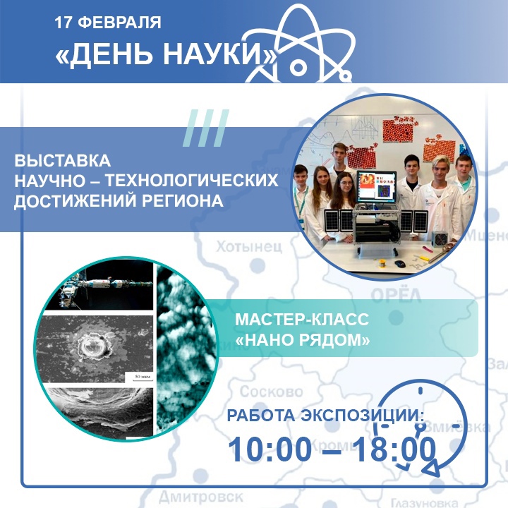 В эту субботу, 17 февраля, на ВДНХ пройдет День науки. На стенде Орловской области гостей ожидает выставка научно – технологических достижений региона; мастер-класс «Нано рядом» (космос). Посетители познакомятся с высокотехнологичным оборудованием и проектом "Первый в мире сканирующий зондовый микроскоп для исследований в космическом пространстве в области «НАНО»", смогут наблюдать за особенностями организации поверхности материалов на наноуровне.