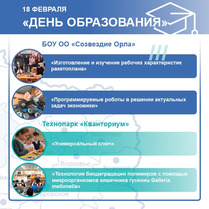 Вы также сможете познакомиться с деятельностью центра «Созвездие Орла», с системой профессионального образования региона, с жизнью Дворца пионеров и школьников имени Ю. А. Гагарина. Гости смогут узнать много новой и интересной информации о проектах наших маленьких ученых Кванториума и IT-КУБа" и их разработках.