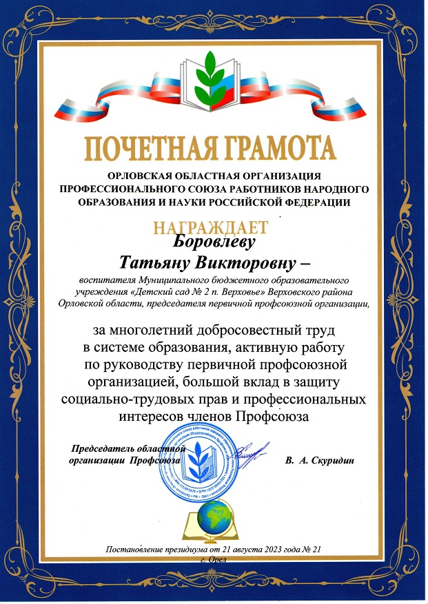 БОРОВЛЕВА ТАТЬЯНА ВИКТОРОВНА- председатель первичной профсоюзной организации ДОУ